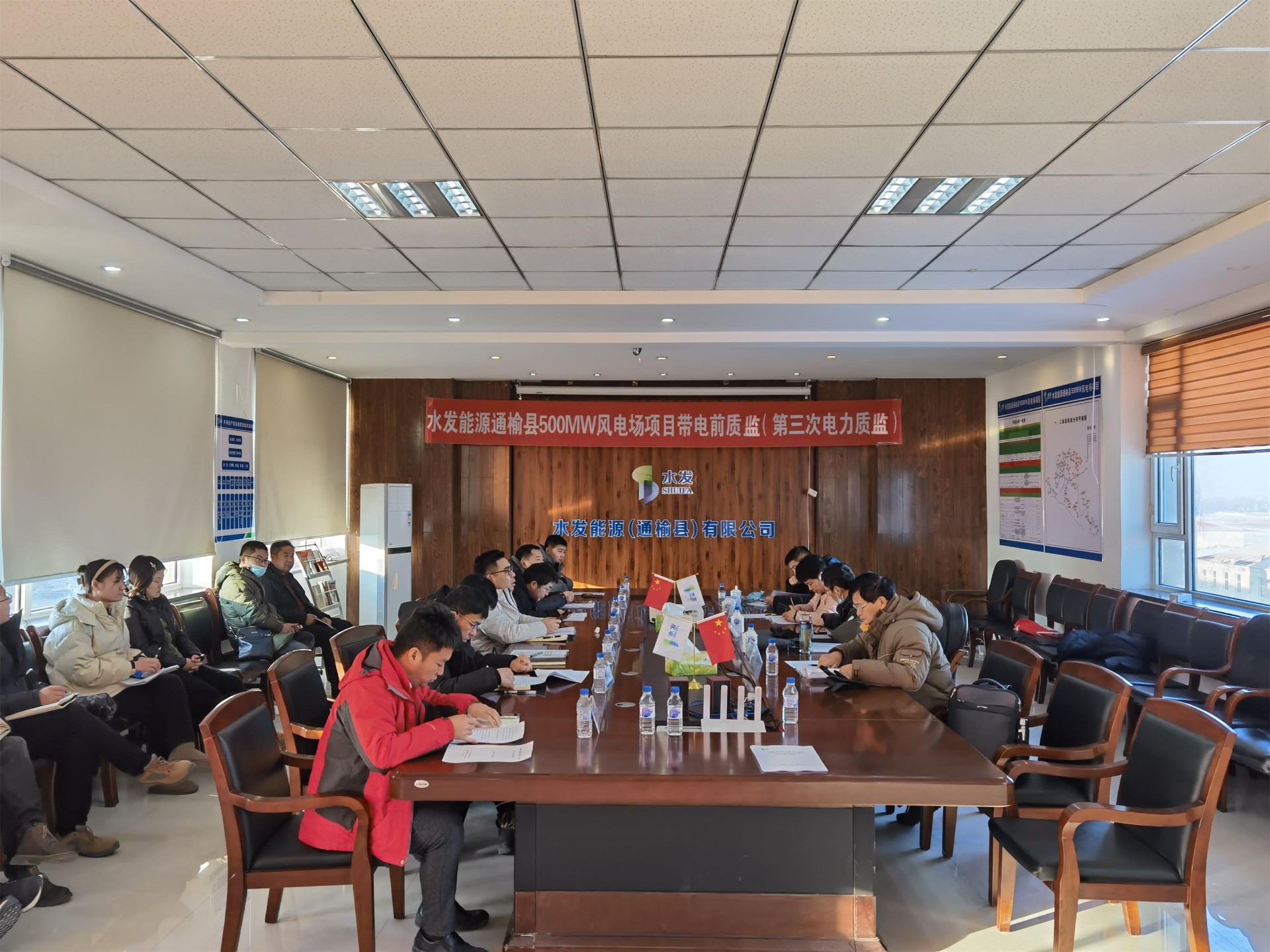 12月23日,可再生能源發(fā)電工程質(zhì)量監(jiān)督站專家組蒞臨水發(fā)能源通榆縣500MW風(fēng)電場項目,開展升壓站受電暨首批風(fēng)電機組啟動試運前質(zhì)量監(jiān)督檢查工作。水發(fā)能源通榆公司、設(shè)計單位、監(jiān)理單位、總包單位及各施工單位積極配合檢查。