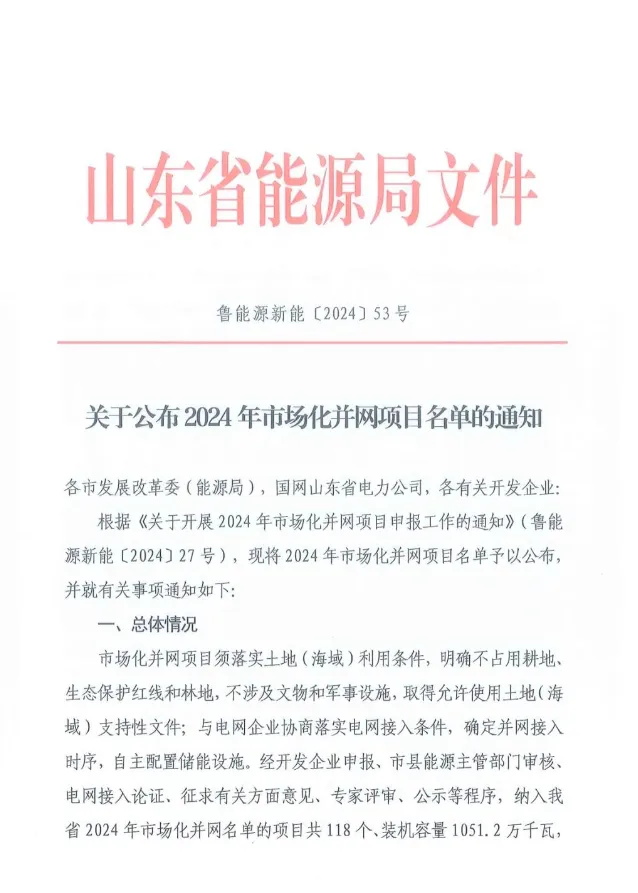 能源資訊丨光伏項目10.46GW!山東2024年市場化并網(wǎng)項目名單公布(附完整名單)